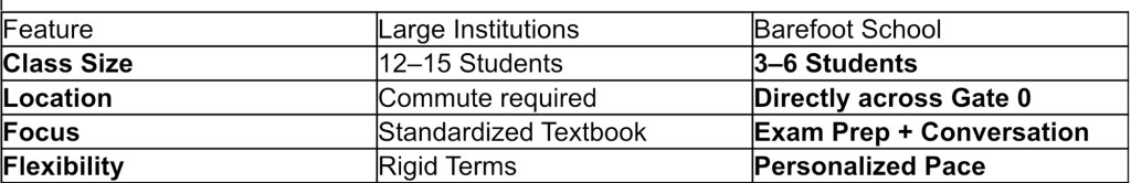 We don’t just “teach English”—we coach students to pass official exams while maintaining the creative, barefoot spirit of learning.